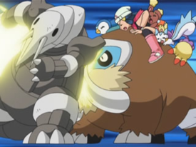 Au final, Aurore et ses Pokémon tombent du haut du ravin. Mammochon a amorti la chute mais est blessé et sa Poké Ball a disparu.