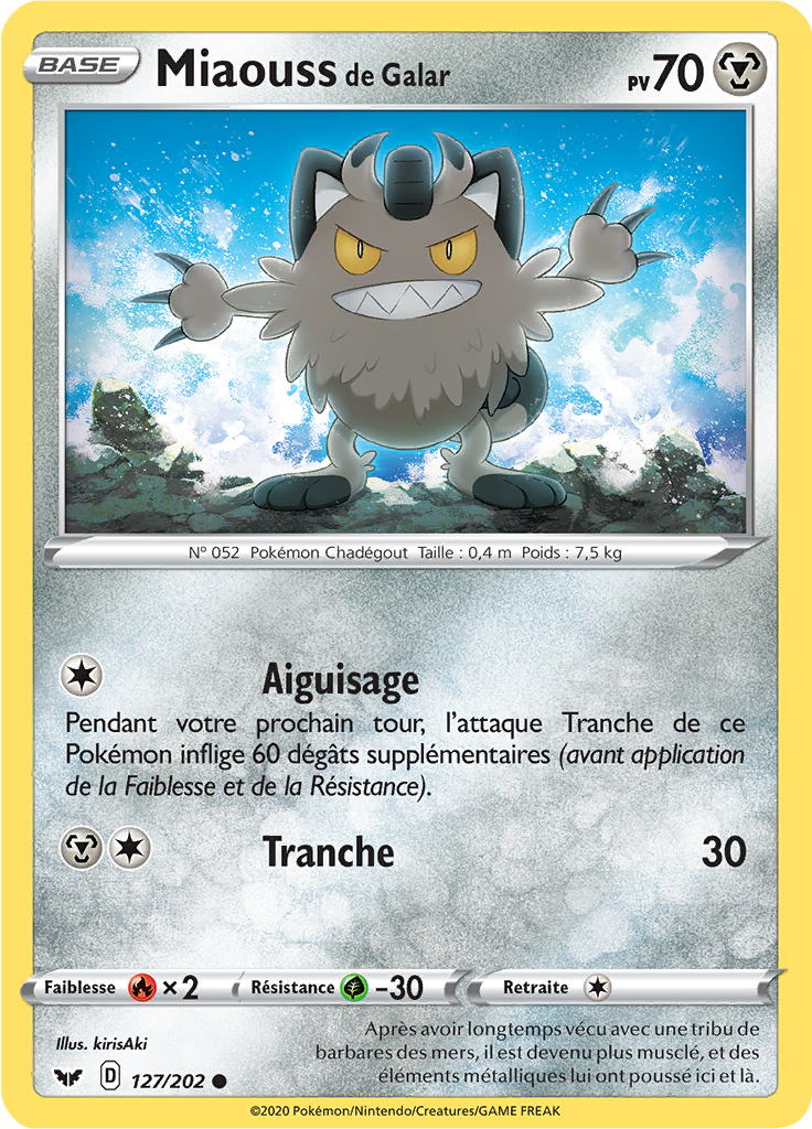 [modifier]Scan de la carte Miaouss de Galar de l'extension Épée et Bouclier.