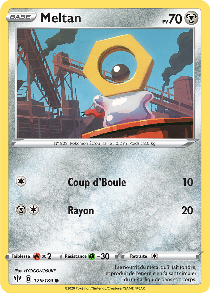 [modifier]Scan de la carte Meltan de l'extension Épée et Bouclier Ténèbres Embrasées.