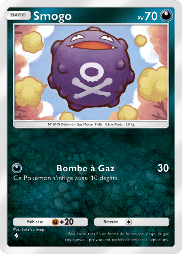 actuel28 avril 2026 à 18:04Vignette pour la version du 28 avril 2026 à 18:04367 × 512 (283 kio)Silvallié (discussion | contributions)Scan de la carte Smogo de l'extension Aura Palpitante. {{Informations Fichier | source=[https://drive.google.com/drive/folders/1_2YURmd7dYnCX3VuDLQobLNSJbAeavpt Google Drive TCGPocket] | auteur=DeNA }} Catégorie:Scan de carte d'Aura Palpitante Catégorie:Scan de carte représentant Smogo