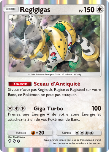actuel28 avril 2026 à 18:05Vignette pour la version du 28 avril 2026 à 18:05367 × 512 (302 kio)Silvallié (discussion | contributions)Scan de la carte Regigigas de l'extension Aura Palpitante. {{Informations Fichier | source=[https://drive.google.com/drive/folders/1_2YURmd7dYnCX3VuDLQobLNSJbAeavpt Google Drive TCGPocket] | auteur=DeNA }} Catégorie:Scan de carte d'Aura Palpitante Catégorie:Scan de carte représentant Regigigas