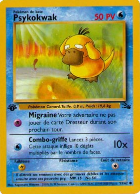 | 1 mars 2009 à 14:25 | 281 × 389 (257 kio) | Zhuquarnage (discussion | contributions) | Scan de la carte Psykokwak de Fossil. Catégorie:Scans des cartes de Fossil Catégorie:Scans des cartes représentant Psykokwak |