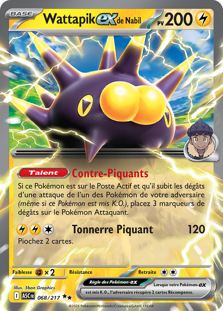 | actuel | 31 janvier 2026 à 10:18 | 736 × 1 024 (688 kio) | Silvallié (discussion | contributions) | Scan de la carte Wattapik{{Symbole JCC|ex}} <small>de Nabil</small> de l'extension Méga-Évolution Héros Transcendants. {{Informations Fichier | source=[https://limitlesstcg.com/cards/fr Limitless] | auteur=The Pokémon Company }} Catégorie:Scan de carte de Méga-Évolution Héros Transcendants Catégorie:Scan de carte représentant Wattapik |