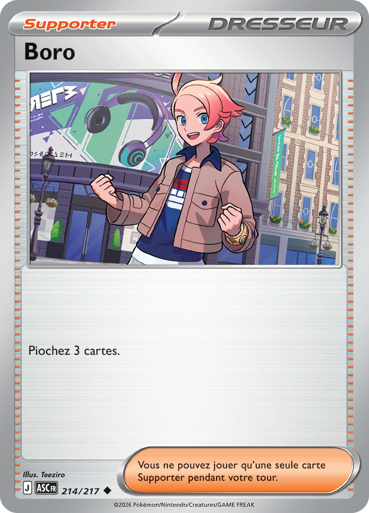 actuel31 janvier 2026 à 10:29Vignette pour la version du 31 janvier 2026 à 10:29736 × 1 024 (413 kio)Silvallié (discussion | contributions)Scan de la carte Boro de l'extension Méga-Évolution Héros Transcendants. {{Informations Fichier | source=[https://limitlesstcg.com/cards/fr Limitless] | auteur=The Pokémon Company }} Catégorie:Scan de carte de Méga-Évolution Héros Transcendants Catégorie:Scan de carte Dresseur