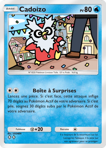 actuel28 janvier 2026 à 18:46Vignette pour la version du 28 janvier 2026 à 18:46367 × 512 (277 kio)Silvallié (discussion | contributions)Scan de la carte Cadoizo de l'extension Parade Onirique. {{Informations Fichier | source=[https://drive.google.com/drive/folders/1_2YURmd7dYnCX3VuDLQobLNSJbAeavpt Google Drive TCGPocket] | auteur=DeNA }} Catégorie:Scan de carte de Parade Onirique Catégorie:Scan de carte représentant Cadoizo