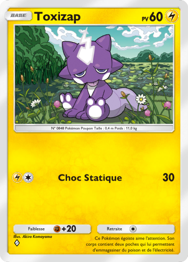 | actuel | 28 janvier 2026 à 18:47 | 367 × 512 (220 kio) | Silvallié (discussion | contributions) | Scan de la carte Toxizap de l'extension Parade Onirique. {{Informations Fichier | source=[https://drive.google.com/drive/folders/1_2YURmd7dYnCX3VuDLQobLNSJbAeavpt Google Drive TCGPocket] | auteur=DeNA }} Catégorie:Scan de carte de Parade Onirique Catégorie:Scan de carte représentant Toxizap |