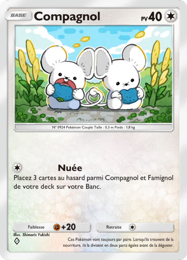 | actuel | 28 janvier 2026 à 18:50 | 367 × 512 (253 kio) | Silvallié (discussion | contributions) | Scan de la carte Compagnol de l'extension Parade Onirique. {{Informations Fichier | source=[https://drive.google.com/drive/folders/1_2YURmd7dYnCX3VuDLQobLNSJbAeavpt Google Drive TCGPocket] | auteur=DeNA }} Catégorie:Scan de carte de Parade Onirique Catégorie:Scan de carte représentant Compagnol |