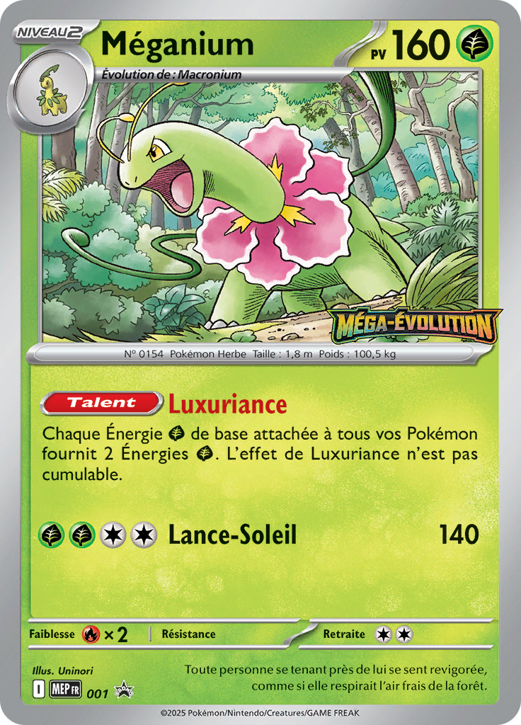 actuel | 26 septembre 2025 à 19:24 | ![]() | 736 × 1 024 (674 kio) | Silvallié (discussion | contributions) | Scan de la carte Méganium de l'extension Promo ME. {{Informations Fichier | source=[https://limitlesstcg.com/cards/fr Limitless] | auteur=The Pokémon Company }} Catégorie:Scan de carte de Promo ME Catégorie:Scan de carte représentant Méganium |