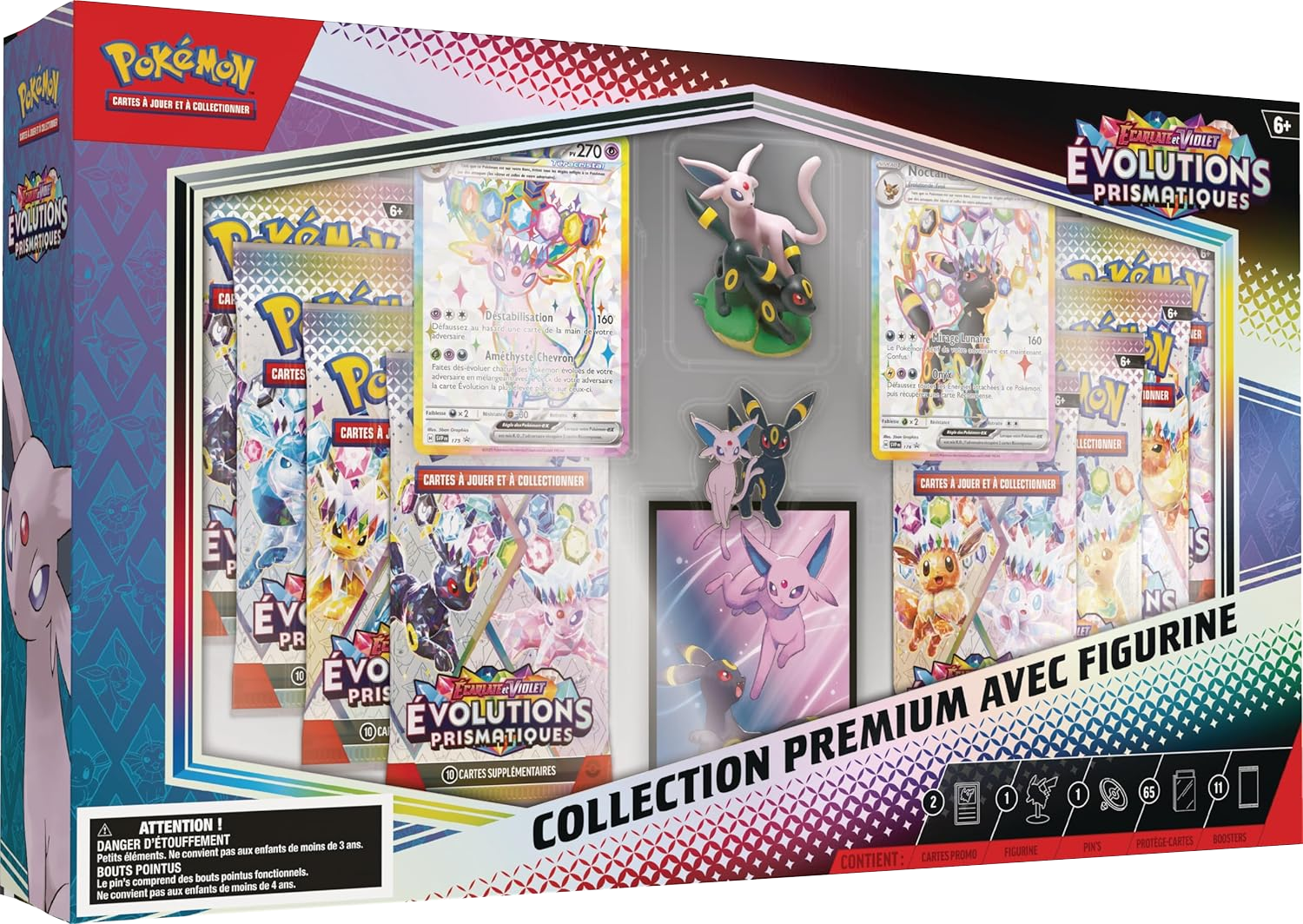 [modifier]Recto de la Collection Premium avec figurine Écarlate et Violet Évolutions Prismatiques de l'extension Écarlate et Violet Évolutions Prismatiques, représentant Mentali et Noctali.
