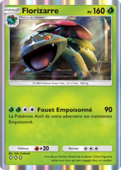 Florizarre est une carte Pokémon de l'extension Embrasement Écarlate, à l'effigie du Pokémon Florizarre. Elle doit être posée sur un Herbizarre pour pouvoir être jouée.