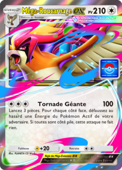 est une carte Pokémon-ex Méga-Évolution de l'extension Promo-B, à l'effigie du Pokémon Méga-Roucarnage. Elle doit être posée sur un Roucoups pour pouvoir être jouée.