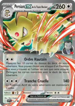 de la Team Rocket  est une carte Pokémon-ex de Dresseur de l'extension Promo SV, à l'effigie du Pokémon Persian. Elle doit être posée sur un Miaouss de la Team Rocket  pour pouvoir être jouée.